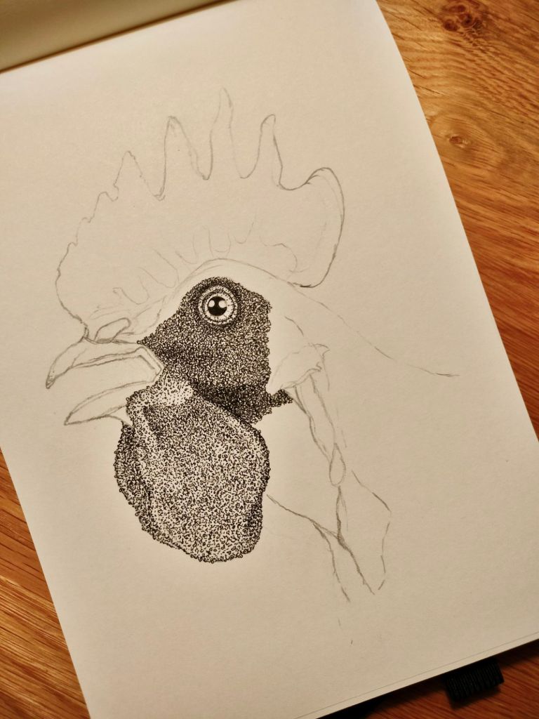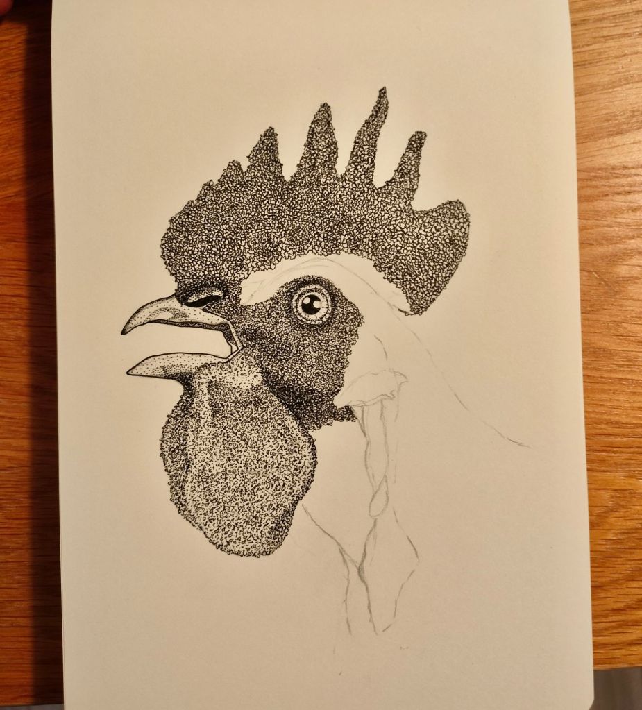 1. Pencil sketch, with starting pen work on the eye, face and wattle.